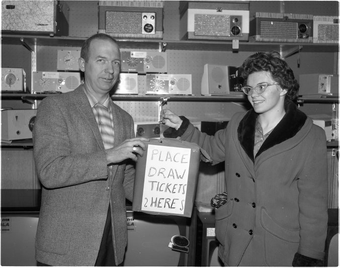 Clint Truax holds the draw box while pretty Barbara Murday draws the ticket that won a transistor radio for Marlene Curry of Wyebridge. Other prizes went to Mrs. Gordon Duggan (Shirley Duggan) of Port McNicoll (toaster) and Jim Stewart Midland (kettle). Barber and Haskill anniversary sale draw.