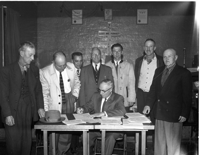Tay Township Clerk Ralph Dalton (seated) was a busy man following Monday night’s nominations as various candidates waited their turn to “sign up” for the election Dec. 12. Left to right the candidates are; Walter Knechtle, Stan Smith, Henry Swaile, Ernie Hurl, Wilf Lafrance, Ken Polkinghorne and John Skelton.