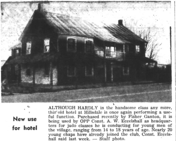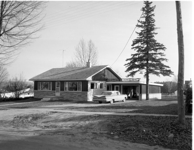Some fine new homes have been built in Hillsdale recently, and the two above would look well in any community. Perched on a pleasant knoll in top picture is the home of Mr. and Mrs. Robert Scott. Lower photo is the new home of former Simcoe County warden Fisher Ganton and Mrs. Ganton.