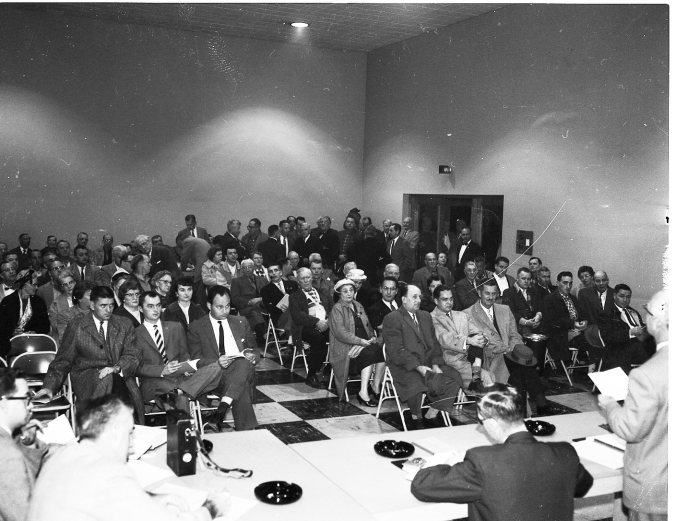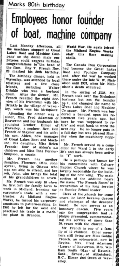 Improvements to various government docks, floats and warehouses in Midland are now being considered by authorities of the Federal Department of Public Works. This optimistic news was the highlight of a public meeting in Midland’s municipal auditorium last night. It was broken to the packed auditorium by Ward 1 aldermanic candidate Arthur W. Argue. Mr Argue said he had received this information in a letter from T. B. McLennan, assistant district engineer for the department in Toronto. In his letter Mr. McLennan, said he referred in particular “to the system of floats between piers C and D which require complete renewal with a new type of float now being designed in this office” Mr. McLennan said he hoped a considerable portion of the work can be done this winter so conditions will be improved for the opening of navigation in 1961.