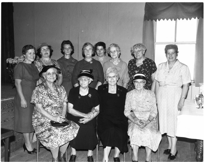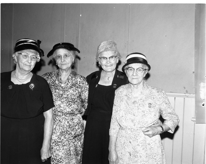 Many years of service to the community have been given by these members of Crossland Women’s Institute, gathered for the 50th anniversary ceremonies Wednesday. They are, left to right, Mrs. Jim Strath, Mrs. R. T. Wallace, Mrs. J. H. Locke, Stayner, and Mrs. Harry Borthwick. Mrs. Locke is a life member and the other three women are charter members of the organization.