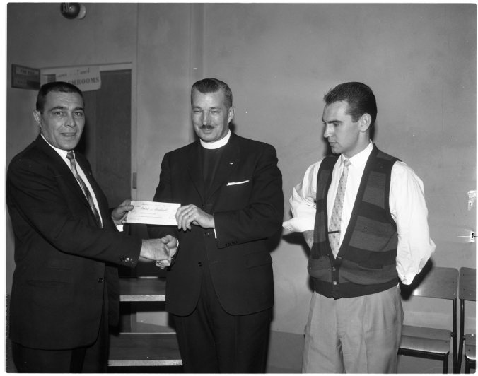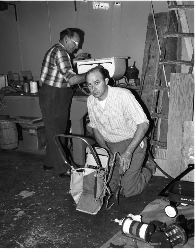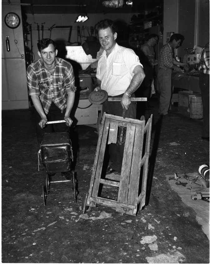 They look pretty hopeless now, but this dilapidated wagon and worn out doll’s carriage will bob up looking like new under some deserving tot’s Christmas tree a few weeks from now. John Dumais (left) and Bob Gidley are only two of the members of Pillsbury’s Midland staff who are devoting several nights a week to putting the old toys back in shape.