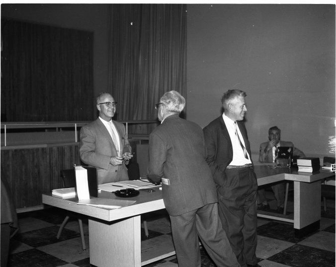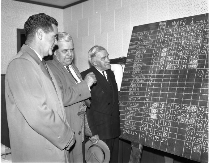 William Beaton, PUC candidate, William Logan (led poll in PUC contest) and Percy Crawford, newly-elected reeve, study results of Monday night’s municipal election.