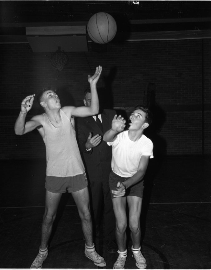 Little League basketball got underway at Midland YMCA this week and here Morie Whitcher, ‘Y’ president (behind players), tosses up the first ball for Paul Downer, left, and Wayne Holden to battle over.