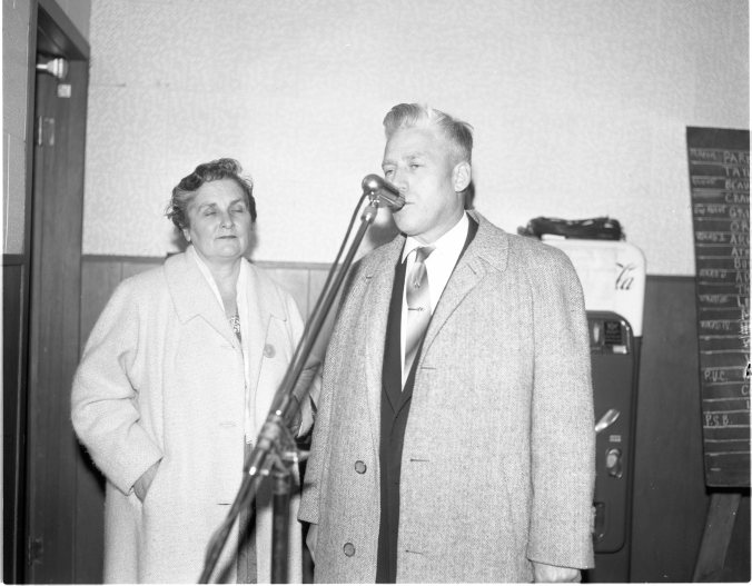 Winner in Monday’s election, Mayor Charles Parker expresses his thanks to the electors over radio station CKMP. With him is Mrs. Parker, whom the mayor said talked him out of retirement plans.
