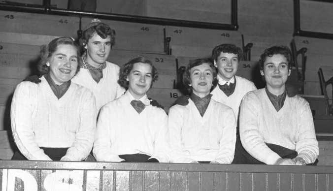 And their cheer leaders; Kathy Hall, Marj Powers, Pat Martin, Margaret Ann Moore, Lorna Edwards and Marion Lemieux.