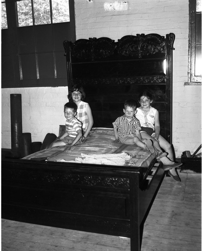 “Just like the one grandmother used to have,” said these youngsters as they tried out this huge old-fashioned bed, one of the many articles offered at the auction sale held by St. Mark’s Laymen’s Association in Midland May 28. At left are Leslie Hillman and Scott Haig, with Debbie Hillman and Tommy Thompson at the right. The bed, and everything else, was disposed of by auctioneer Milt Trace.