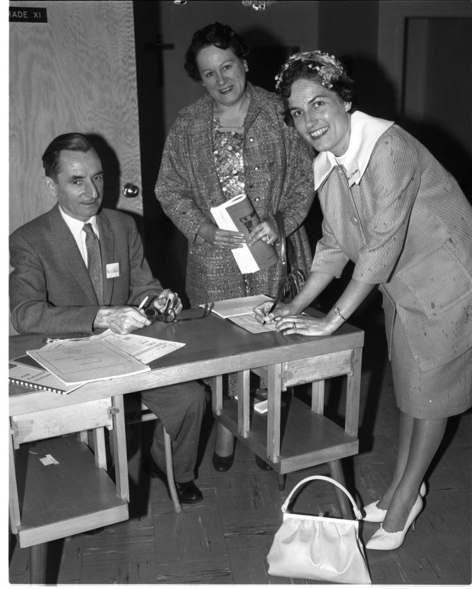 Unique among the 40 or more delegates who attended a conference held by District 20 members of the Ontario English-Catholic Teachers’ Association in Midland last week was this mother-daughter combination of Mrs. Phil D’Aoust, left, of St. Joseph’s School, Penetang, and Mrs. Robert Stalker of Guardian Angels’ School, Orillia. Watching them “sign-in” is James Shaw, of St. Theresa’s High School staff, Midland.