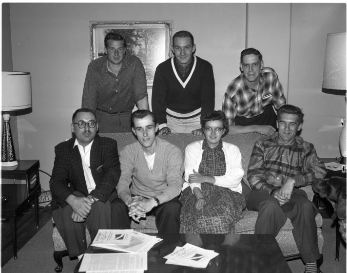 Skin diving, a sport whose popularity has been increasing steadily in this area, is now on an organized basis in Midland with the formation of a new club. Officers are, left to right, front row, Bill Mitchell, president; Charlie Sweet, director; Elizabeth Cleaver, secretary-treasurer; Roger Adams, director; back row, Bill Wagg, John Power and Derek Spencer, directors. Another meeting of the club is slated for Saturday night at Arena Gardens.