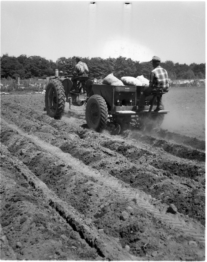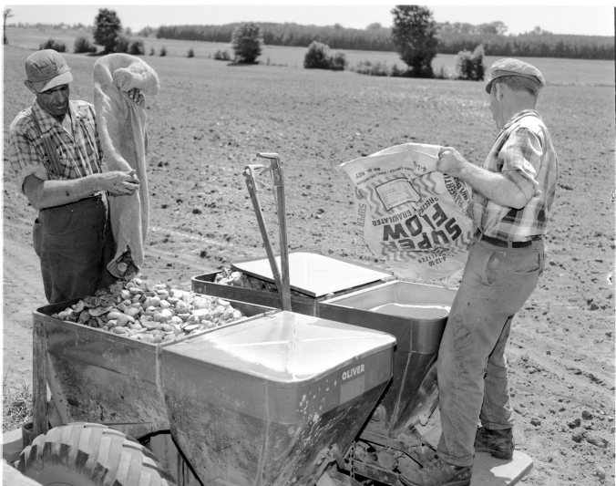 Potato planting was never like this in the old days, this machine being loaded with potatoes by Phil Beaudoin, left, with fertilizer by Ben Laurin, right, will plant 1 1/2 acres per hour. They are working on one of Herman Marion’s fields on Con. I8, Tiny, near Laurin school.