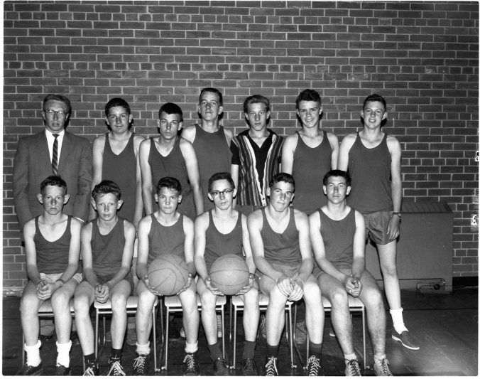 Something new was added to the sport scene at Parkview and Regent Public Schools in Midland this year, when basketball became a major sport at both schools. The Regent team, above, won the title by-taking the seventh and deciding game by a 38-13 count in a match played at the YMCA. Members of the winning team are, left to right, front row—Hans Matthias, Chester Graham, Morley Bath, Cecil Merkley, Don Moffatt and Tom Gordanier; back row, Coach J. Soden, Doug Taylor, Paul Downer, Doug Faint, Roy Jean, Neil Murday, Allan McElroy.