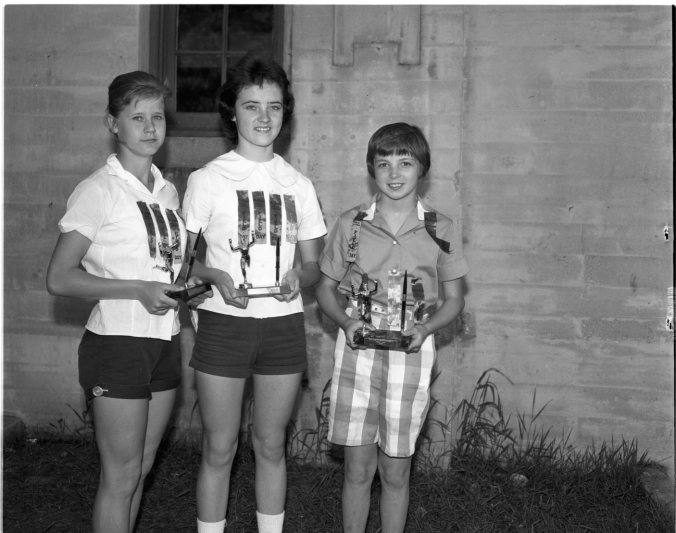 Friday was a big day for Midland Public School children as they held their annual field day at Town Park. Girls’ champions were, left to right, Nancy Higgs (senior), Lynda Duggan (intermediate) and Pamela Ellison (junior). Pamela was the only girl title winner from Parkview. Nancy and Lynda attend Regent School.