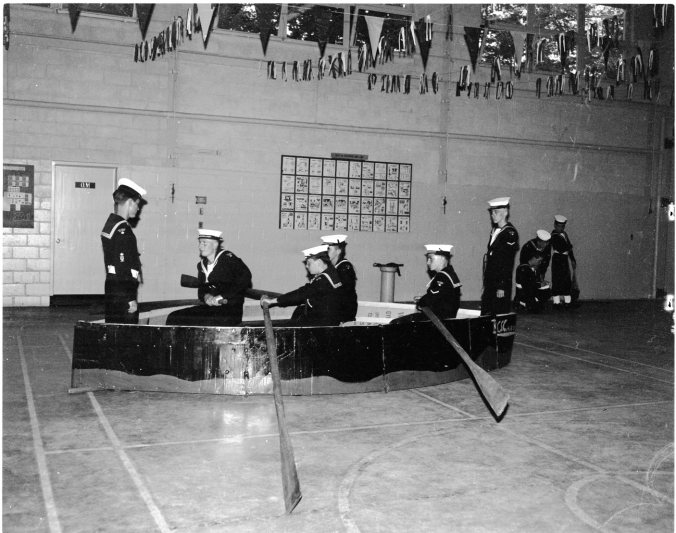 These lads can “heave-ho” to their heart’s content, but they won’t be going anywhere. Their “craft,” an imitation one, is pretty firmly anchored to the door of the Midland armory, where RCSCC “Huron” had its annual inspection last Wednesday night.