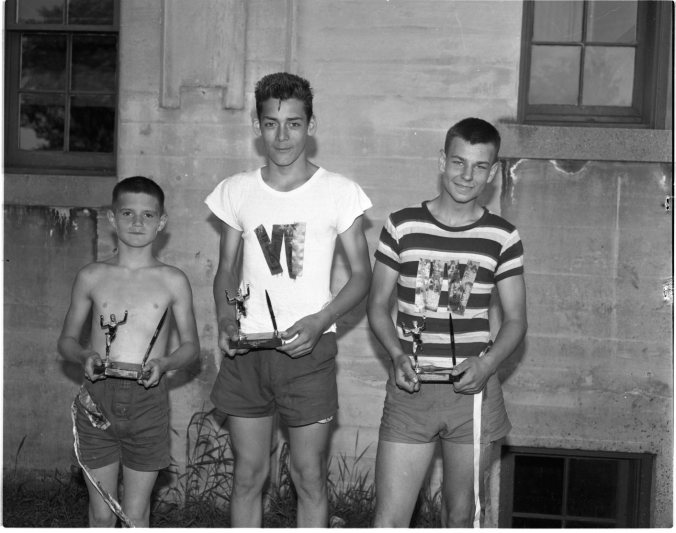 Smallest “man” in this picture, David Gosselin (left) was a title winner too, at Midland Public Schools field day Friday. David won the junior boys’ crown for Parkview School while Randy Jones (centre) won the intermediate and Paul Downer the senior championships for Regent School.
