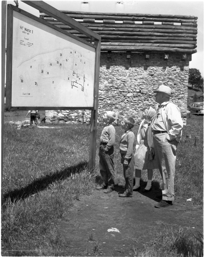 “That’s the way it was back in 1649,” said Dr. Wilfrid Jury, as he explained the lay-out of old Fort Ste. Marie to four tads from his own old public school, S.S. 9, Lobo Township, Friday. Nearly 50 pupils made the long trip from the school, 10 miles west of London, to spend the day touring historic sites in Huronia with Dr. Jury.