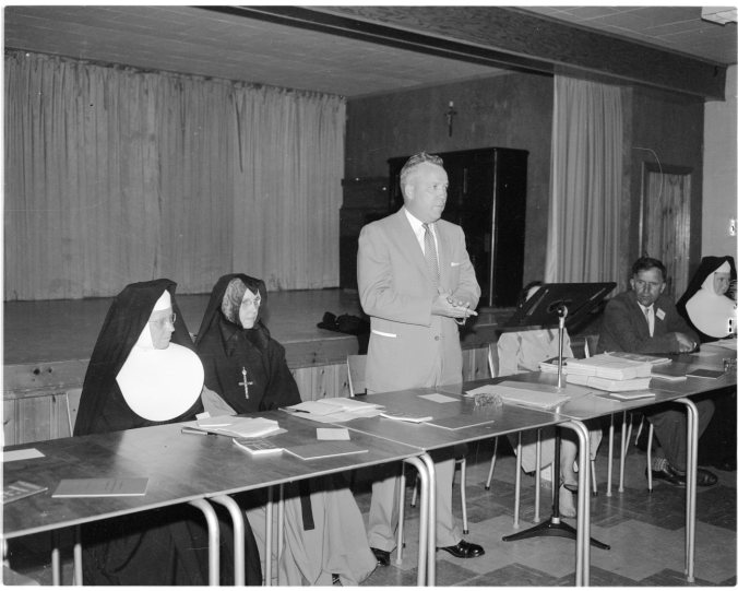 More than 40 North Simcoe members of the Ontario English-Catholic Teachers’ Association were present at a Teachers convention held at St. Theresa’s High School auditorium, Midland, May 30. F. J. MacDonald, B.A., of Barrie, public and separate school inspector, is seen addressing the group above. At the table are Sister M. St. Gervaise, Orillia, and Sister Mary Ruth, Waubaushene.