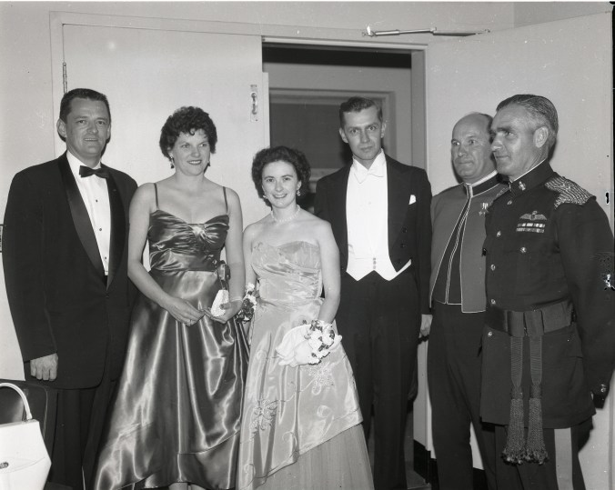 Officers of the Midland squadron of the Grey and Simcoe Foresters held a reception for Lieut. Cm. A. J. Symons at the Armory last Saturday night, marking his elevation to command of the regiment. Left to right, are Mr. and Mrs. William Barnett, Mrs. Haig and Alderman Douglas Haig, Lieut.-Col. Symons, and Lieut. James Downer. Officers and wives from Orillia, Owen Sound and other nearby centers attended the gala affair.