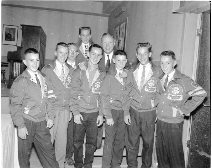 Bantam All Ontario Champions – Art Desroches, Peter Berry, Paul Solmes, Terry Timmons, Bill Lepage, Foster Hewitt, Peter Dubeau, Doug Scott, Ron Moreau. (Identified by Waxy Gregoire.) Newspaper caption; It was a toss-up whether these championship hockey players from Penetang got a greater kick out of their new jackets or from being photographed with Foster Hewitt, whose “hockey night in Canada” booms out over the airwaves during winter months. Boys are all members of NHL Ontario championship team.