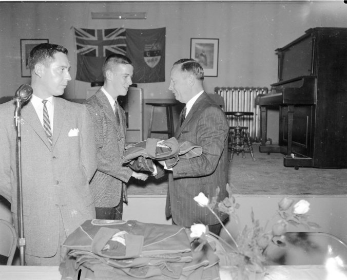 Joe Lamoureux, Mike Dubeau (receiving jacket), Foster Hewitt. Caption from the newspaper in which Mr. Lamoureux was cropped out, “Mike Dubeau, captain of Penetang Little NHL championship team gets a handshake and new jackets from Foster Hewitt at a banquet in Penetang May 30”.