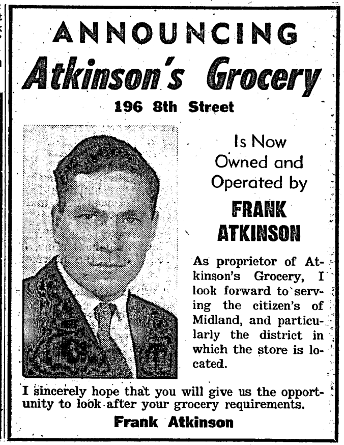 Atkinson’s Grocery Store has changed hands but the name remains unchanged. This was announced Saturday by Frank Atkinson when he advised that he had recently bought the Eighth Street store from his cousin, Albert Atkinson. The new owner, who came to Midland from Holland Landing nine years ago, stated he and his wife, Glendine, would operate the store on the same basis as his cousin had done.