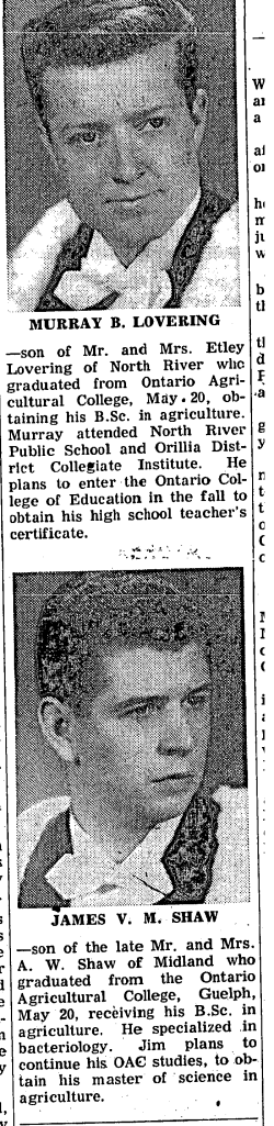 Among the many young people from this area graduating from Universities this year was Leo Marion, 21-year-old son of Mr. and Mrs. Herman Marion RR 3, Penetang. Mr. Marion graduated this spring from Oka College of Agriculture, an affiliate of the University of Montreal. He is now employed by the Federal Department of Agriculture as a seed inspector in the Chatham Sarnia area. One of the first young men of this area to become an inspector for the department, Leo attended Lafontaine Continuation School, where he graduated in 1955. For the past five years he has been attending courses at Oka College.