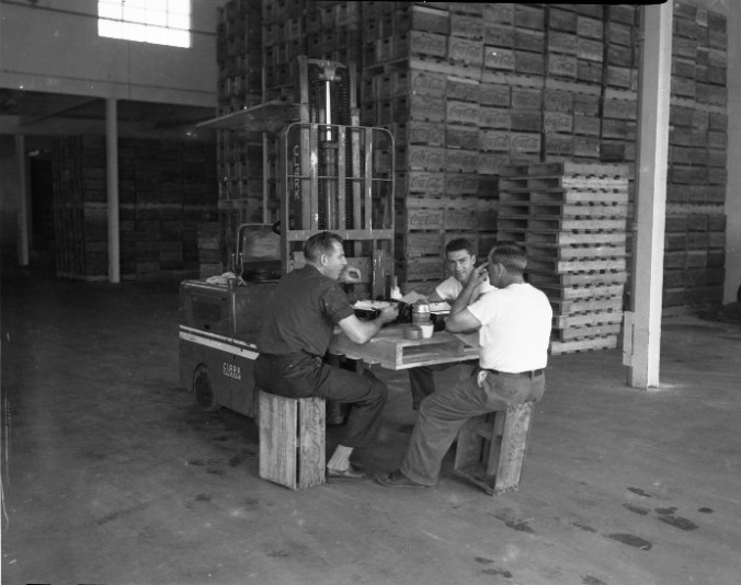 Employees of Penetang Bottling Co. have discovered that a front-end loader makes an ideal adjustable picnic table. When lunchtime comes round they roll a loader into position in the spacious storage area and enjoy their meal at a table set to their desired height.