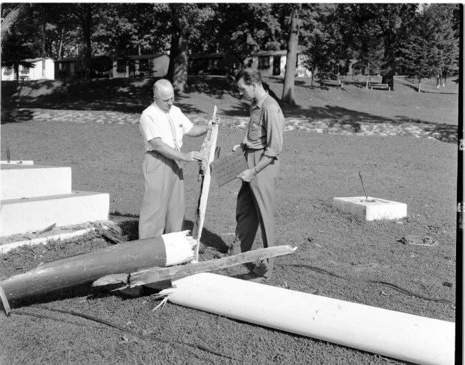 This old wooden pestle was found by Teddy, 12, and Tommy Parkes, 14 of Toronto on the south shore of Midland’s Little Lake last week. Dr. Wilfrid Jury, University of Western Ontario archaeologist, has identified the pestle as of the type used by the Huron Indians of this area to pound grain into flour some 300 years ago.