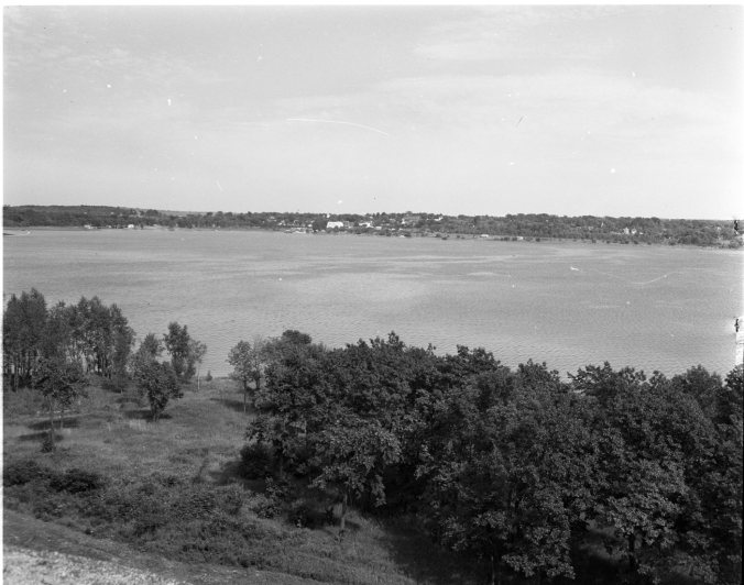 Sweeping view of Hog Bay and Victoria Harbour can be had from the roof of the CPR elevator in Port McNicoll. Trees in the foreground are part of Maple Island, which contains the elevator and grain door divisions of the company’s vast operations in Port McNicoll.