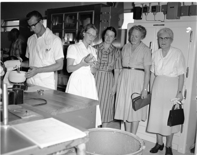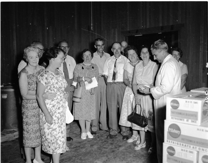One of the items on the agenda of the summer meeting of the directors of the Ontario Soil and Crop Improvement Association in Midland this week was a visit to Pillsbury Canada Limited cake mix plant. Of particular interest to the women was a visit to the laboratory, where home economist Mrs. Don Robertson is explaining the good points of a pineapple cake. Allan James, analytical chemist, is seen at left. Delegates examine another phase of production in the modern plant.