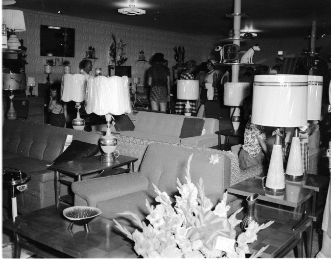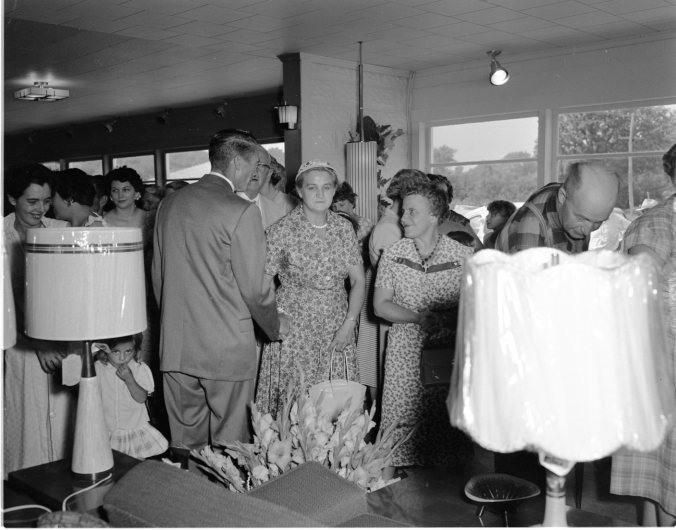 Opening of the new wing of Dunlop’s Furniture and Appliance store drew large crowds to Moonstone Tuesday. Lloyd Dunlop is seen greeting old friends as they filed into the new wing, a general view of which is seen.