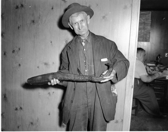 There’s plenty of eating in this cucumber held by Peter Muirhead, grown by C. Moreau, 96 Donalda Street, it was 30 inches long, and there were some even longer in the Moreau garden, Mr. Muirhead reported.