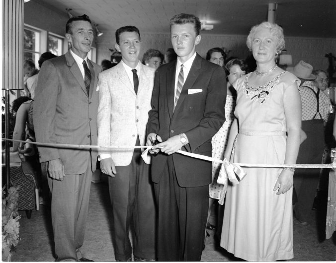 Tuesday was a proud day for Lloyd Dunlop and family as they opened their new furniture wing of their Moonstone store; son Douglas, a vice-president of the firm at 18 years of age, was given the honour of cutting the ribbon. Watching are his father, brother Jim, and Mrs. Dunlop.