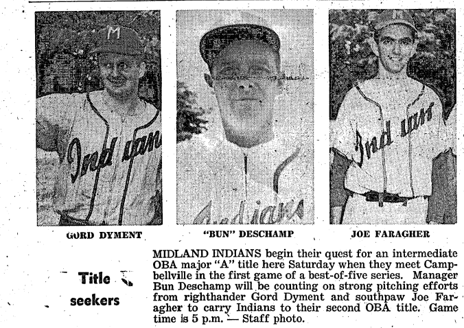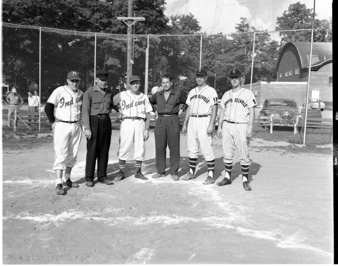 Just before the battle between Midland Indians and Campbellville Merchants Saturday, the umpires went over the ground rules with representatives of the two clubs. The game was “called after 13 innings with the score tied, 1-1. Left to right are Murray Yorke, the plate umpire, Andy McLean, manager “Bun” Deschamp, umpire Jim Cauthers, manager Len Andrews and Bill Elliott of Campbellville. Same teams meet here again Saturday at 5 p.m.