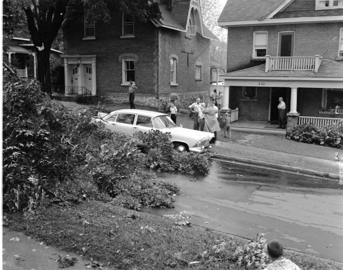 Large limb blown from a tree in Wednesday afternoon’s rain and wind storm caused some $200 damage to the electrical wiring in the James Clarkson residence, 230 Elizabeth Street, Midland (Just west of First Street.). When the limb fell it narrowly missed hitting a new car in the foreground.