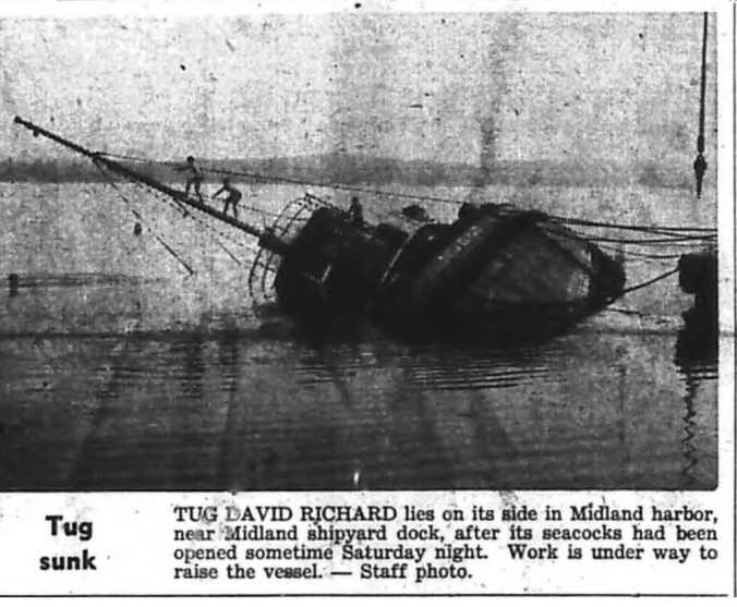 - Free Press Herald headline of September 2, 1959; Vandals Damage Tug Sinks at Shipyard Dock.