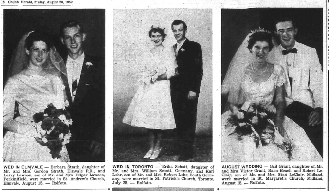 - BIRTHS – CALDWELL – To Mr. and Mrs. Austin Caldwell, 1381 Chrisiden Dr., Port Credit, at St. Andrew’s Hospital, Midland, Sunday, August 30, 1959, a daughter. COWDEN – To Mr. and Mrs. Ernest Cowden, 278 Midland Ave. Midland, at St. Andrew’s Hospital, Monday, August 31, 1959, a daughter. CUNNINGHAM – To Mr. and Mrs. Charles Cunningham, R.R. 1, Honey Harbour, a St. Andrew’s Hospital, Midland, Friday, August 28, 1959, a daughter. DION – To Mr. and Mrs. Robert Dion, 352 Russell St., Midland, at Andrew’s Hospital, Saturday, August 29, 1959, a daughter. DORION – To Mr. and Mrs. Bernard Dorion, Victoria Harbour, at St. Andrew’s Hospital, Midland, Saturday, August 29, 1959, a daughter. GILBERT – To Mr. and Mrs. Thomas Gilbert, 143 Sixth St., Midland, at St. Andrew’s Hospital, Sunday, August 30, 1959, a son. LALONDE – To Mr. and Mrs. Bernard Lalonde, Yonge St., Midland, at St. Andrew’s Hospital, Wednesday, August 26, 1959, a daughter. LATONDBESS – To Mr. and Mrs. Donald Latondress, King St. Midland, at St. Andrew’s Hospital, Thursday, August 27, 1959, a daughter. McINTAGGART-To Mr. and Mrs. Michael Mclntaggart, 178 Lindsay St., Midland, at St. Andrew’s Hospital, Saturday, August 29, 1959, a son.