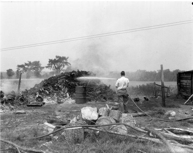 Midland firemen got a long run Sunday morning when they were called to the farm home of Orval Truax in Tay Township, near Waverley. Burned was a shed containing a number of chickens and ducks. A fireman is seen here trying to put out a large pile of firewood which also fell prey to the flames.