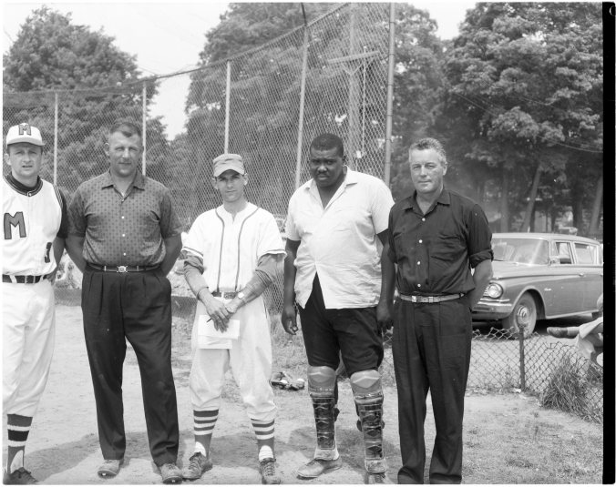 Temperatures that soared into the 90’s Sunday afternoon proved anything but a boon to South Simcoe Baseball League officials in staging their second All-Star game in Midland Sunday afternoon. The defending champion Midland Indians thwarted the All-Stars’ plans for two straight wins by coming up with a 5-3 victory. All-Stars had won the first game last year by trimming Alliston Braves, the 1960 champs, by an 8-3 margin. League officials had hoped for a crowd of 500 or better to boost their injured player fund. But the heat and high humidity sent many fans to the beaches, or other cooler spots, and only about 300 turned up at the game. Despite the humid atmosphere and a brief rain and wind storm midway through the affair, the fans were treated to a tidy tussle between playing coach Gord Dyment’s Indians and 17 players chosen from the other 12 teams in the two-section league.