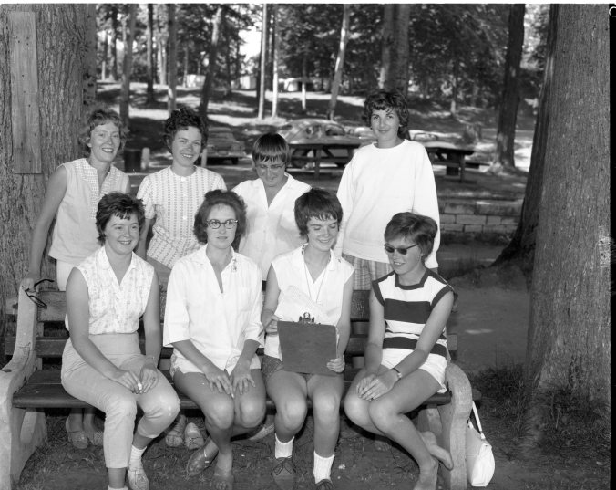 These eight girls are up to their ears in kids these days as they help look after the more than 400 children signed up for Midland Y’s Men’s Club’s summer program at Little Lake. Left to right are; front row — Mary Lou Graham, in charge of crafts; Betty Jean Watkinson, games, and counsellors Barbara Dalrymple and Gudron Mandler; back row — counsellors Betty Ann McCullough, Judy McIntyre, Eden Morrison and Wynne Gilmore.