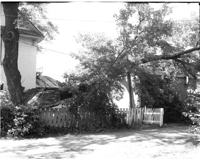 Trees in town, as well as in the park, were not spared by the storm Sunday. Half of this huge old elm crashed down in the yard of Rolf Litchenfeld, King Street. Fortunately it landed squarely between two houses and no great damage was caused. This occurred late at night, long after the original storm.