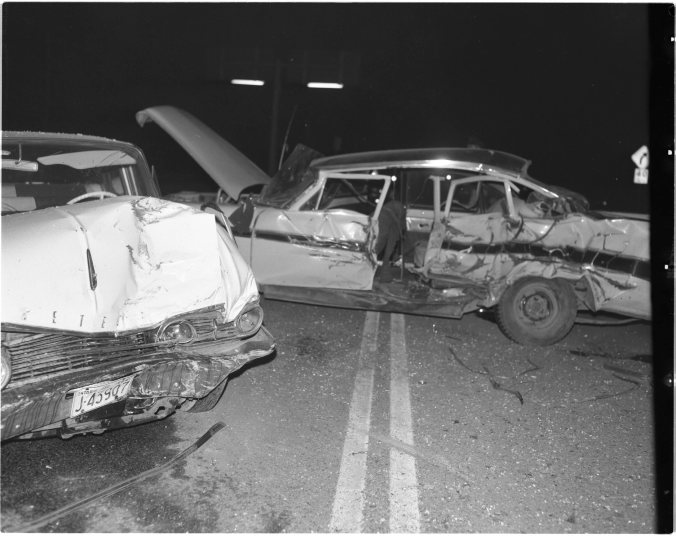 Two Midland women received severe face and head injuries when these two cars collided at Firth’s Corners, one mile west of Midland, last night. A third car, not seen in the picture, was also involved but sustained only minor damage. Most seriously hurt were Mrs. Mac Perrin, driver of one car, and Miss June Hansford, a front seat passenger, both of Midland. Miss Hansford was thrown through the windshield and sustained severe head and facial lacerations. Mrs. Perrin suffered a broken jaw and lost a number of teeth. Another passenger in the car, Mrs. Elsie Puddicombe, riding in the back seat, escaped with minor bruises. Miss Hansford and Mrs. Puddicombe were being driven home from the Brooklea Golf and Country Club where they were employed by Mr. and Mrs. Perrin.