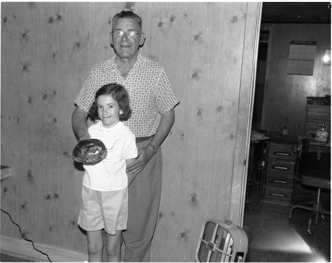 Jim Neilon, Victoria, B.C., proves that the big ones don’t always get away. He is shown here with his niece, Kathryn Bourgeois, holding the head of an 18-pound catfish he caught in the Muscosh (as spelled in the paper) district recently. Mr. Neilon is currently visiting his sister Mrs. Lionel Bourgeois of Midland.