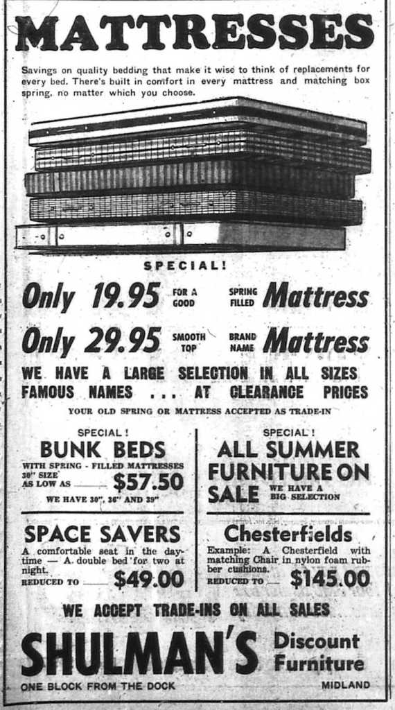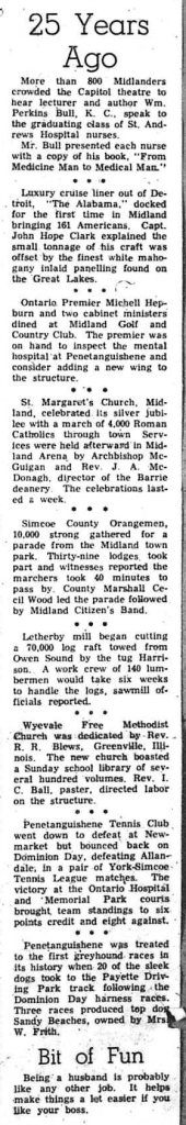 Midland fire department installed a $3,500 radio alarm system climaxing a year’s debate to provide speedier protection. The King Street fire hall transmitter beamed instant communication to 21 receiving sets in volunteer firemen’s homes. * * * An archaeological sensation shook accepted theories when Islington contractor Frank Ridley assembled pottery fragments at several “Lalonde” sites. The pottery matched designs on Iroquois pottery excavated from northern New York State. Mr. Ridley exhibited his pots at Huronia House Museum as proof of his claim that the Iroquois once inhabited Huronia. * * * Footings for 20 Wireless Hill rental houses, built in anticipation of the needs of newly arrived Ernst Leitz (Canada) Limited workers, were poured on Midland’s outskirts. Construction of the Leitz factory kept pace with steel roofing being erected. * * * The Inter-Town softball League admitted a Gravenhurst team, creating a five-team loop. The original four teams were: Midland, RCAF, Stewarts and Barrie. * * * A war against the mosquito menace was advocated at a Midland Kiwanis Club luncheon by Bill Keller Jr., son of Deputy-reeve and Mrs. W. H. Keller, Midland. Bill, a student entomologist at University of Manitoba, confirmed there are 59 varieties of mosquitoes in Canada. “Though the adult mosquito has a lifespan of only two or three days, he may travel 20 or 30 miles in a high wind.” the student said as he called for widespread spraying to deal with the pests. * * * Coldwater’s four United Church pastoral charges received Rev. A. Cumming, formerly of Huttonville. Rev. W. R. Auld, Midland, presided at the induction ceremony. Rev. A. K. Kaellgren, Uhthoff, addressed the new minister and the congregation. Rev. Auld commended the good work completed by former Coldwater pastor, J. R. Holden, called to Little Current. * * * Waubaushene’s fifth annual regatta, staged by the local chamber of commerce, drew more than 1,000 spectators. Midland Boy’s Band led a parade including Waubaushene scout troop and decorated cars to the town dock where water sports were held. * * * The Waubaushene opening of Elim Homes attracted 250 spectators. Sponsored by Ontario Gospel Halls, the home was designed to care for needy, aged or infirm Gospel Hall members.
