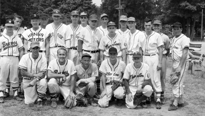 There were really two All-Star teams in action in the South Simcoe Baseball League “dream game” in Midland Sunday, judging by the results. Defending league champions, Midland Indians scored a 5-3 win over the All-Stars chosen from the other twelve teams in the wide-spread league, shown here. Hot weather kept attendance below expectations.