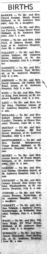 Midland and district doctors have thrown their support behind their Saskatchewan colleagues (one of whom is a former Midlander) in their dispute with the government over the western province’s Medical Care Insurance Act. At a special meeting Tuesday of local doctors of Midland, Penetanguishene and immediate area, a resolution endorsing the Saskatchewan medicos’ refusal to accept the existing Medicare Act was endorsed unanimously. The resolution reads: “We, the local doctors of Midland district wish to record our support of the Saskatchewan doctors in their refusal to accept the Saskatchewan Medical Care Act. We also deplore the dictatorial, undemocratic and tyrannical attitude of the Saskatchewan cabinet.”