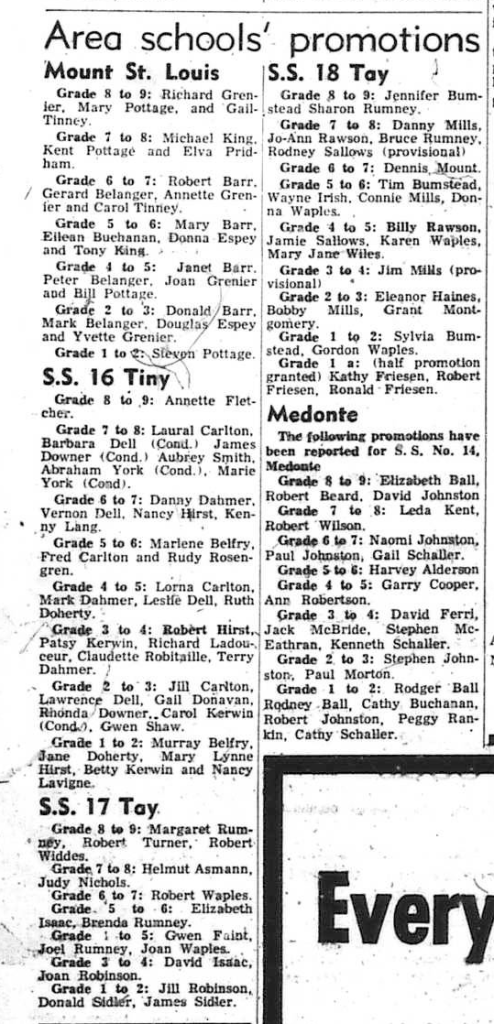 Tiny Township School Section No. 14 at Wyevale will have doubled its present capacity by the end of this year, according to Jack Brock, one of the trustees. At a recent public meeting, ratepayers of the section agreed to the additional expenditure. According to Mr. Brock, the new construction will include two classrooms, a new heating system and new washrooms. Estimated cost for the work is $53,000. Mr. Brock told Tiny Township Council that the enlarged school would, if found necessary in the future, be big enough to accommodate an area school.