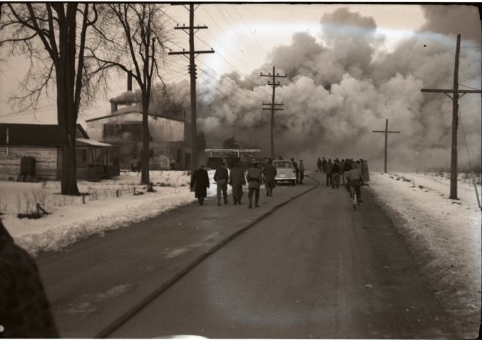 A familiar landmark in Midland’s east end is the old Shearlings (Woolen Ware) plant that was destroyed by fire several years ago. The location is the north side of Yonge Street between Princess and William Streets. The top picture was taken during the fire in March of 1954. It is being demolished by the owner and local contractor Henry Bernick. Demolition and salvage are being carried out by Sylvester Sutter of Port McNicoll. All buildings except the former warehouse will be razed.