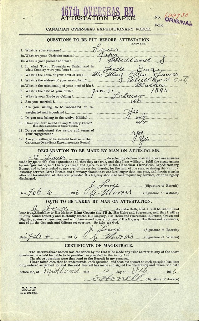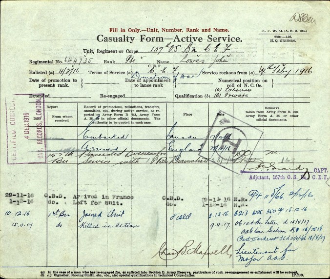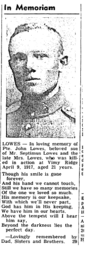 The battle at Vimy Ridge is being commemorated by Canadians both here and at the memorial in France. John Lowes was born in England, emigrated with his family in 1905 and lived at 162 Sixth Street Midland. John enlisted at the age of 20 and was killed on the first day of the battle of Vimy Ridge, April 9th, 1917. For many years the “In Memoriam” above was posted in the Midland paper during the second week of April. His mother Mary died at the age of 82 in November of 1956 and his father Septimus died on June 14, 1960. He was one of sixty-eight local men who died during the first war.