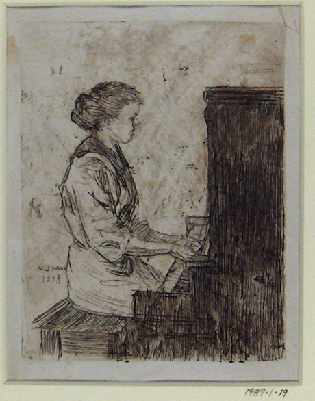 “Hart House purchased one of Wood’s paintings of a girl playing a violin. His own letter regarding the painting appeared in Canadian Paintings in Hart House. ‘It represents’, he wrote, ‘more to me than a “Woman with a Violin”. The woman whom it recalls is a lassie playing by ear the songs and hymns of Auld Scotland, the homeland of my father. I painted “Memory’s Melodies” when the Grants visited us in the evening and Mrs Grant played her violin…after I had ten hours in the auto-body works in Penetang. The mellow colour of the canvas is due no doubt to its being done at night by the usual electric light. The paint is home brew from dry colours. Do I love a violin? Do I? it’s as beautiful as a bark canoe I once bought of an Indian at Byng Inlet and lost the next day as belonging to another Indian. My attitude towards the arts is that where your heart is, there your art is also.’