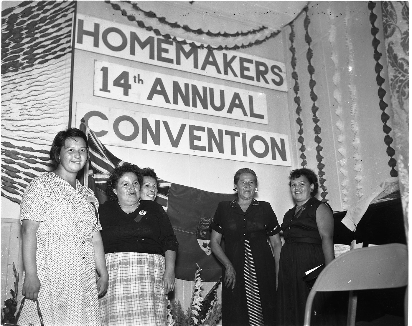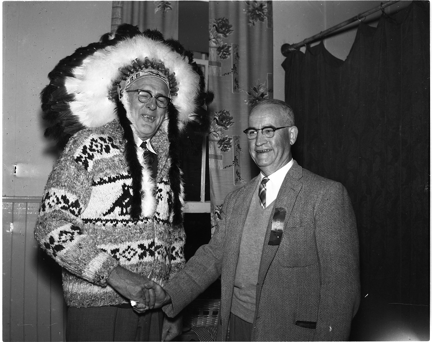“Mrs. Lorna Sandy, left, president of Christian Island Homemakers Club presented a birch bark sewing basket to Mrs. James Gladstone during Achievement Day ceremonies, October 8. ”